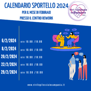 L’Associazione VIVI L’EPILESSIA IN CAMPANIA ODV comunica che lo Sportello di Ascolto inaugurato lo scorso anno resterà attivo presso il Centro Riunioni REWORK al Centro Direzionale isola E2 in via Porzio n°4 NAPOLI nelle date del 6, dell’8, del 20, del 22 e del 29 febbraio dalle ore 16 alle ore 18.